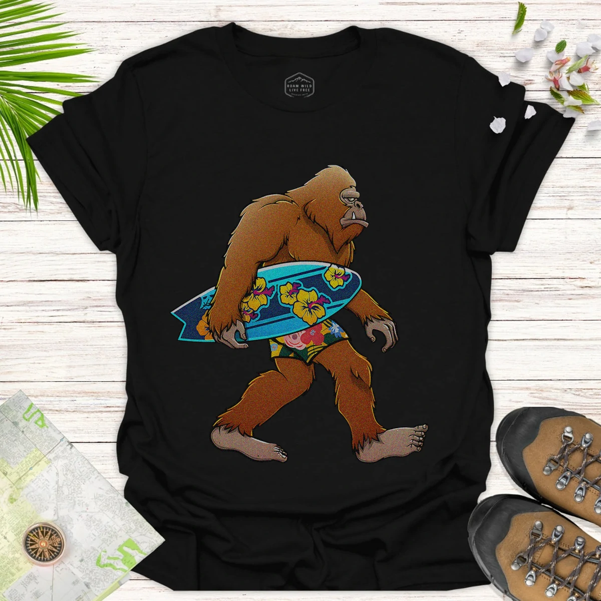 Sasquatch Surfer T-Shirt — Retro Bigfoot with Hawaiian Surfboard Tee
